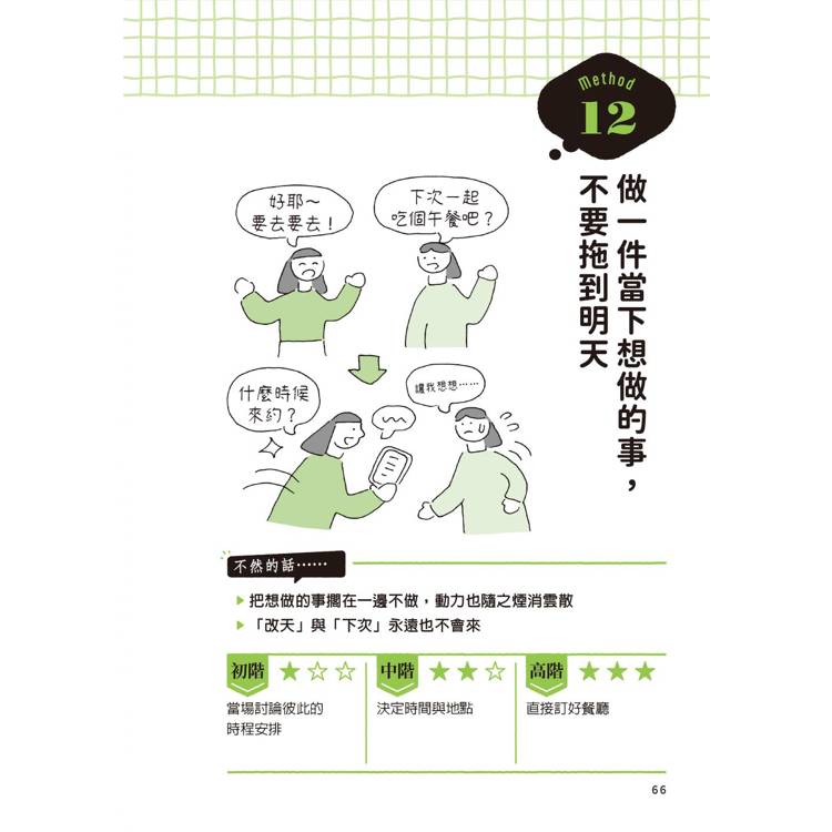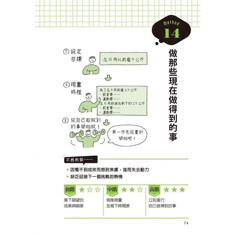 本書的55個方法皆採取三段式結構:理解→啟動→持續。先教你辨識拖延的心理機制,以及連鎖反應所產生的後果;再透過能夠立即上手的微行動,或是初階→中階→高階的漸進式目標,幫你把第一步拆解到能夠「無痛啟動」;最後,教你如何設計長期維持的節奏,讓行動成為習慣而不是一時衝動。很快的,你將成為一個敢想也敢做的人,徹底打破「我辦不到」的自我限制。