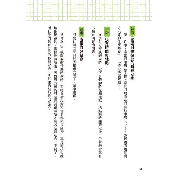 我希望你也不要從一開始就追求完美無缺,而是逐步累積「做得到的事情」。這些積累下來的成功體驗將轉化為自信,讓自己能夠積極地展開行動。為了盡可能讓大家可以更容易踏出第一步,本書的部分章節會把具體的行動方針分成「初階」、「中階」和「高階」來做說明。
