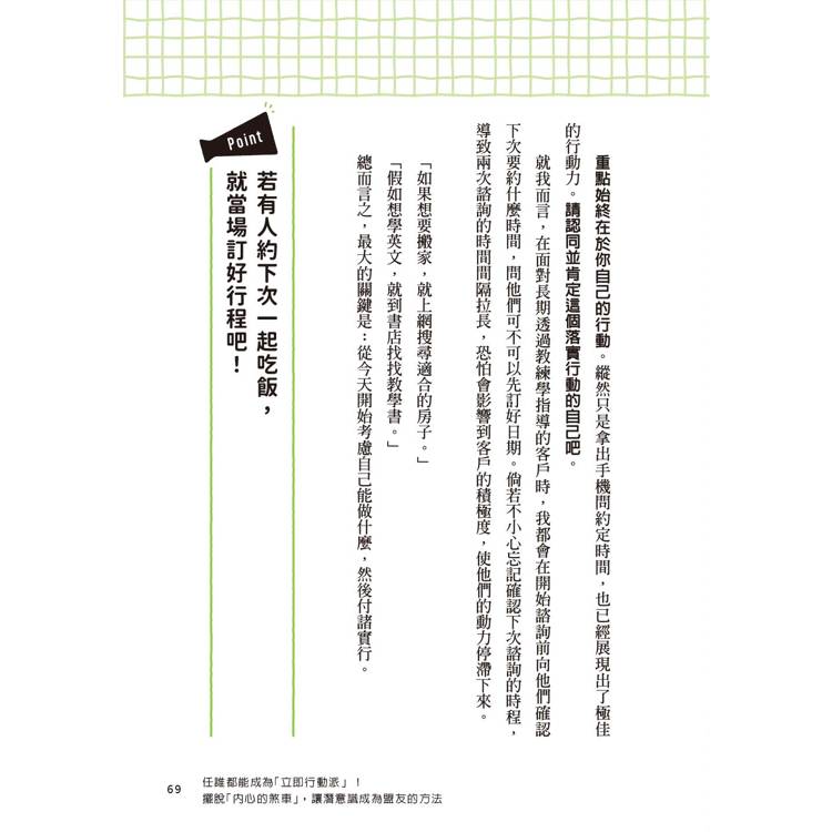 一般人無法「馬上行動」的問題根源非常多,並非單純因為懶散或缺乏意志力,而是包含著潛意識中的恐懼、完美主義、習慣性逃避等等心理機制,只是自己不了解真正的問題到底在哪。這本書將帶你認識並拆解那些隱形的心理絆腳石,徹底看懂「行動」究竟如何發生。用簡單易做的練習,拆掉「我不行」的心牆;把大目標切割成幾分鐘內就能完成的小任務,從小小的成功開始累積,再一步步長出自信。你將體驗到——原來行動其實不是靠意志力死撐,而是需要「設計」。