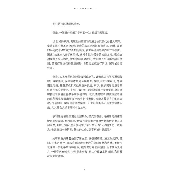 給亨利看病的醫生出了個主意:當個藥劑師。這工作安靜、體面,在室內進行,大部分時間待在藥店的後面配藥和售藥。他還可以聘請一個助手替他幹重活。額外的好處也很明顯:近水樓台先得月,一旦發病有藥吃,特別是止痛藥。這工作確實足夠清閒,和靜養沒有甚麼區別。