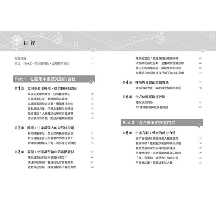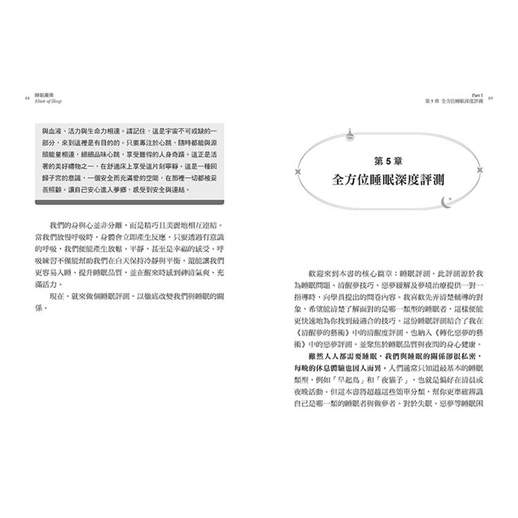 Part 1探索如何擁抱美妙睡眠:探究睡眠中的自我本質、將臥室轉化為神聖空間、記錄睡眠日記,並剖析獲得優質睡眠的關鍵步驟。我們將探索夢的象徵力量,創建專屬夢咒語,並學習呼吸技巧幫助瞬間進入寧靜狀態。這部分最後是一份睡眠評測:建議預留25分鐘完整作答,此為本書核心基礎。你的回答將幫助釐清與睡眠的關係,確認你是哪種類型的睡眠者與做夢者,從而鎖定專屬解方。