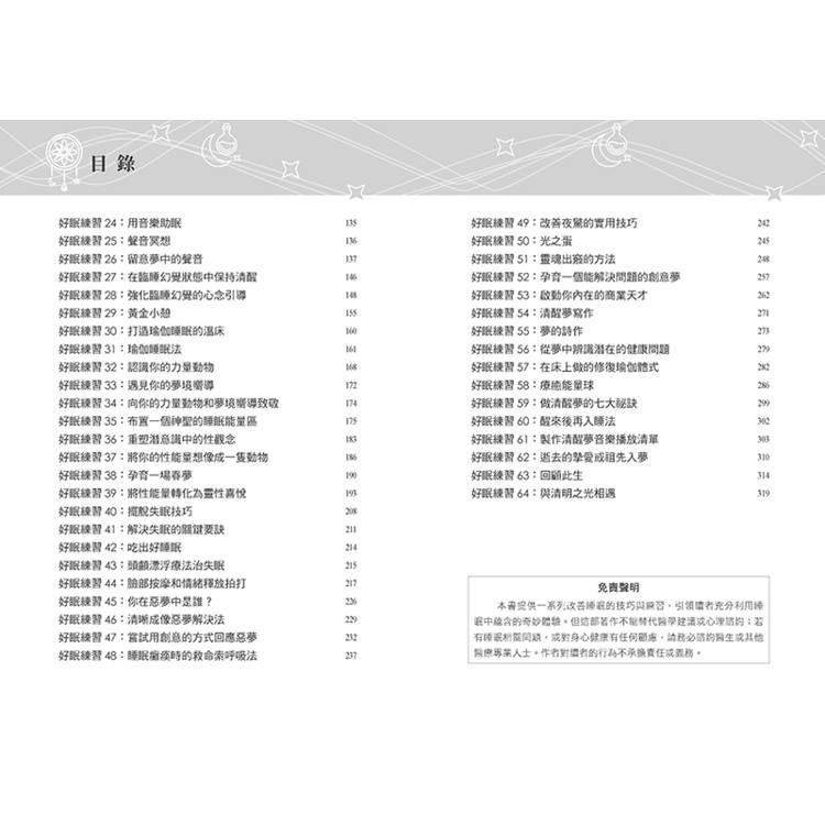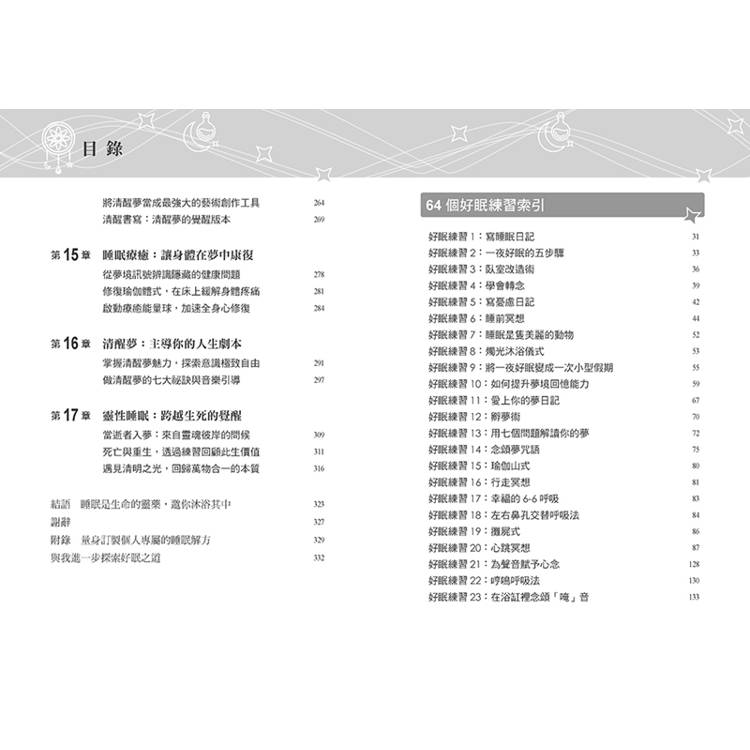 本書提供64個有效的睡眠練習,涵蓋呼吸法、冥想、夢境探索、音療、瑜伽休息術⋯⋯
