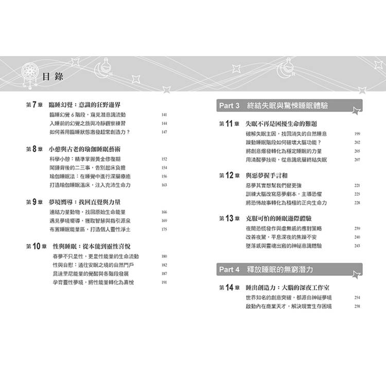 Part 4將探討解決問題的夢,啟動潛意識力量獲取藝術靈感、人生指引與創新商機。我們將見證夢如何協助辨識健康問題,以及生病或慢性疼痛侵擾時如何睡個好覺。接著,深入探討清醒夢,透過核心技巧引導在夢中覺醒。最後一章將探討與逝去摯愛或祖先連結的夢,並分享「回顧此生冥想」:這項練習能釐清自我本質,賦予生命使命感。透過探索睡眠靈性恩賜,我們將拓展意識疆界。