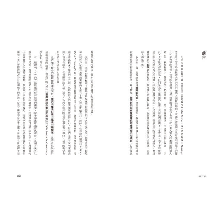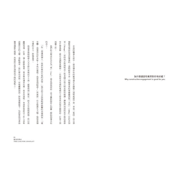 2.真人實境秀《酒吧救援》主持人親授「建設性衝突」獨家心法:作者從小生活在躁鬱症母親的陰影下,為了生存,他學會了如何在警報大響的憤怒之人面前,藉由察言觀色、轉移話題來平息戰爭,並利用衝突將結論導向期望目標。之後也在自己所主持的實境節目《酒吧救援》中,運用這套建設性衝突技巧,協助人們面對真相、展開溝通。