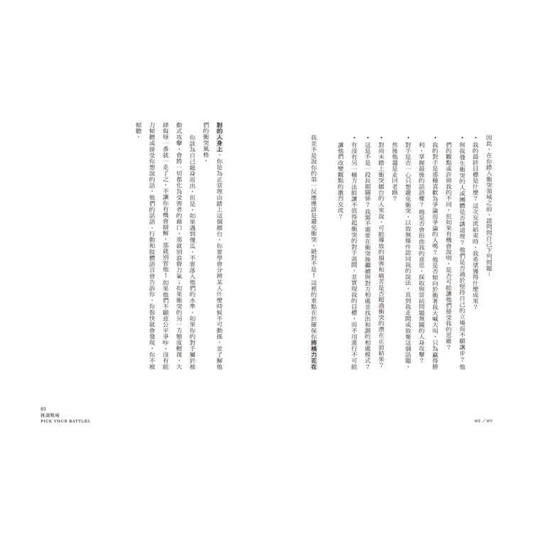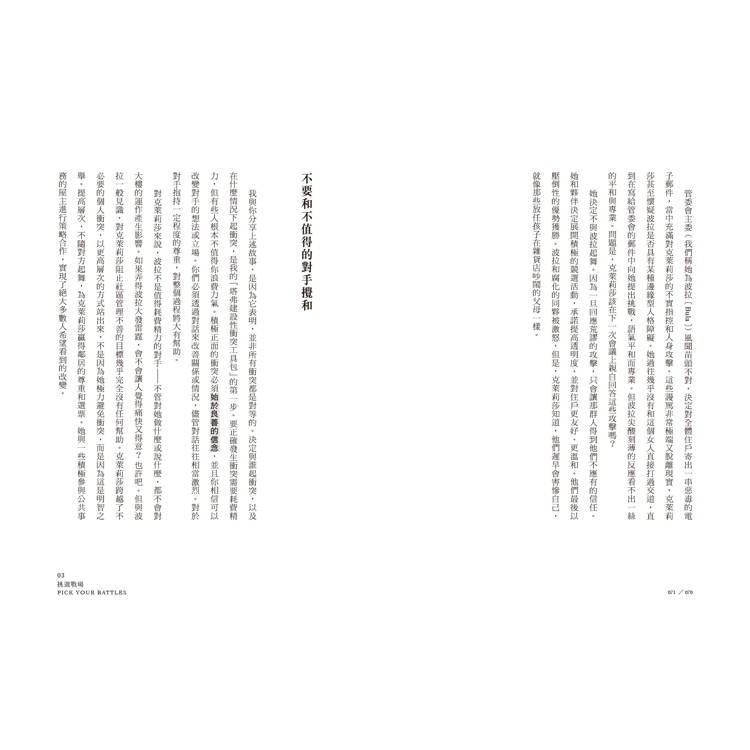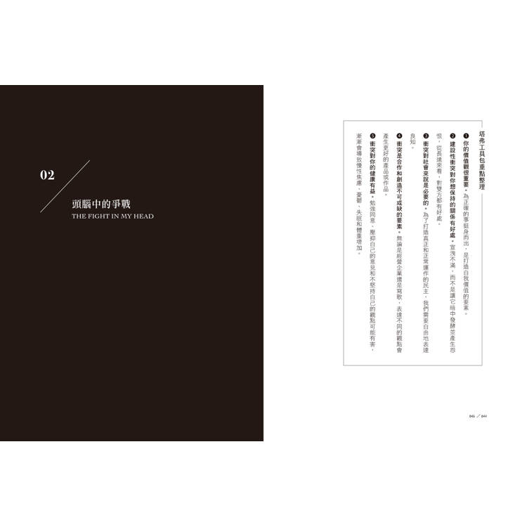1.顛覆你對衝突的想像:沉默、壓抑,處處迴避衝突,只會製造焦慮。而戰略性且不情緒化地面對衝突,不但讓人有機會建立更緊密的關係、激發創造與想像力、解決核心問題,最終還能扭轉局面、實現更深刻的溝通。