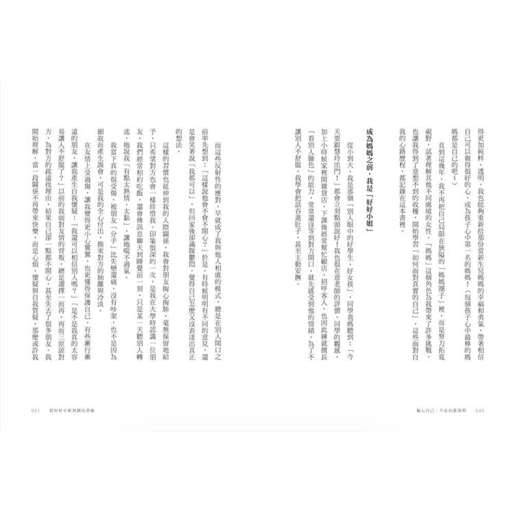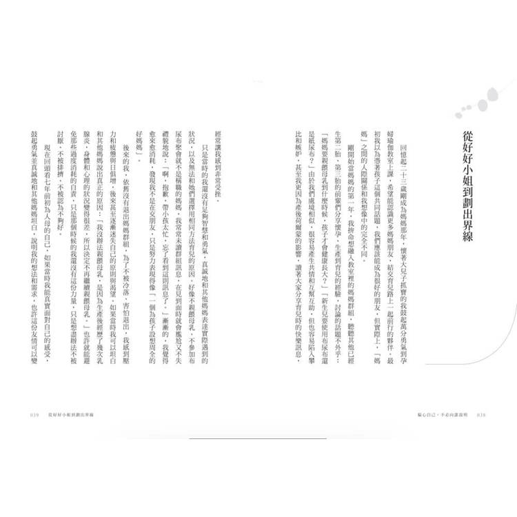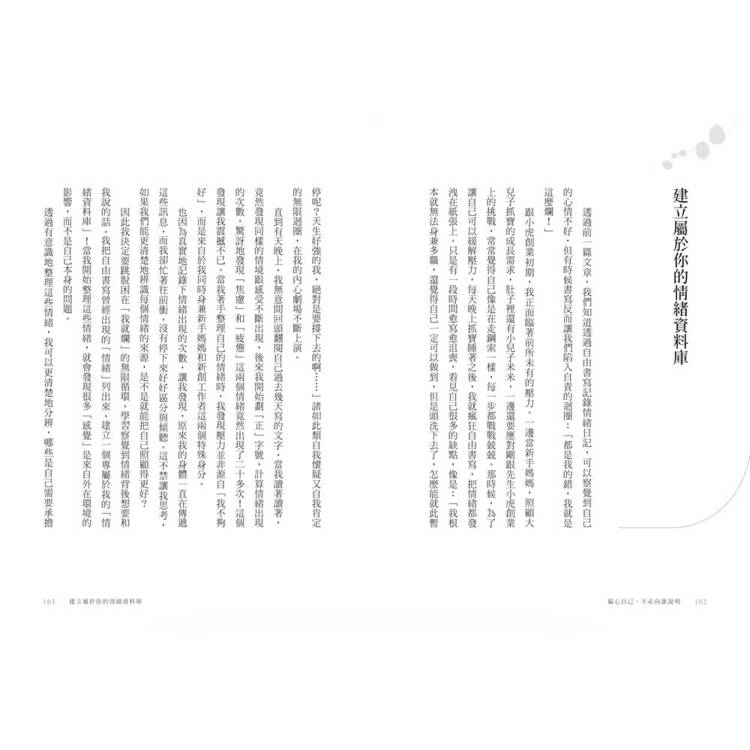 不論是父母、伴侶,創業家或創作者,本書盼引導讀者覺察,付諸行動,在身分交錯的混亂中,重新找到呼吸、找回自己的重量。