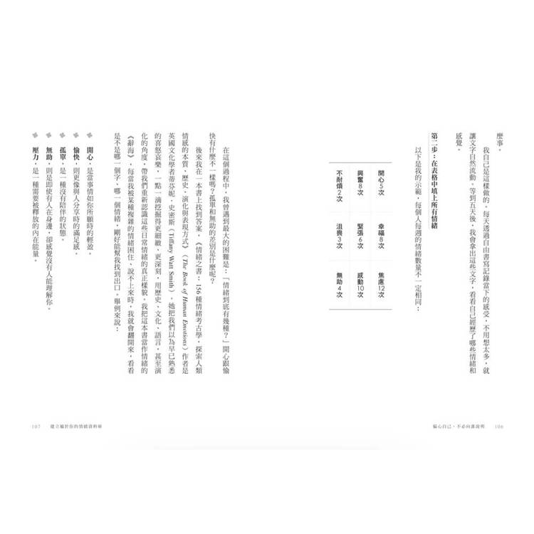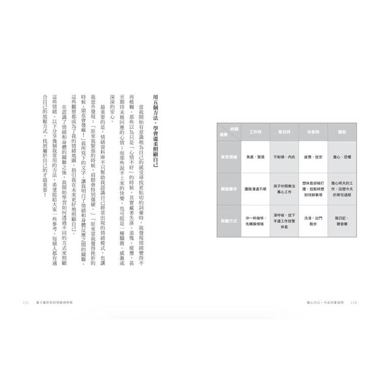 以實際歷程為例證,搭配具體工具技巧,如情緒資料庫、4F引導法、人際關係同心圓等,輔助同樣有相同經歷的讀者能無痛上手。