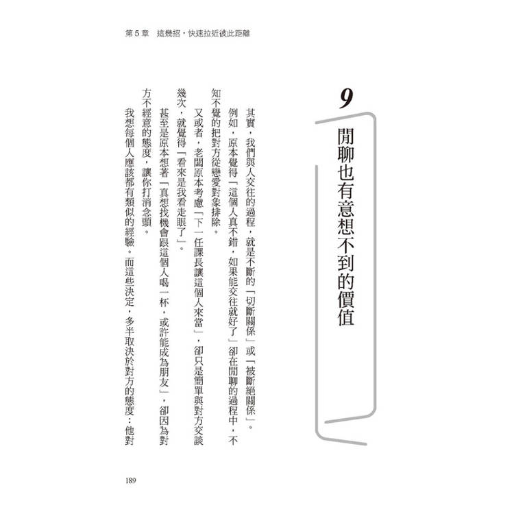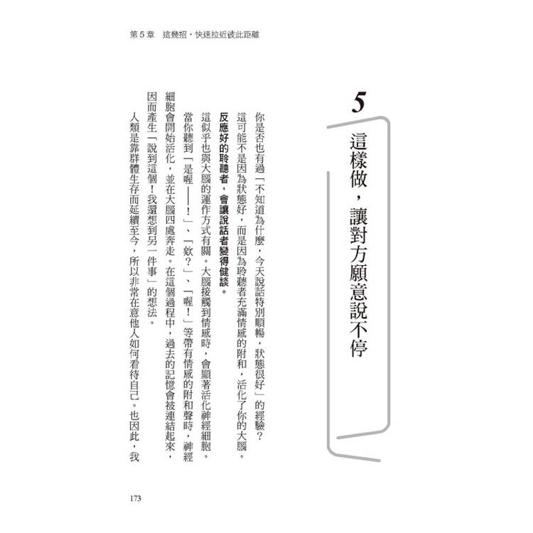 第五章則講述自然熟的說話方式。當你與秒熟人交談時,會不自覺的變得愉快,這是因為他們會給予好的反應和肯定的話語,也會以自己的瑣事和對你的興趣,為你帶來「對話的饗宴」。