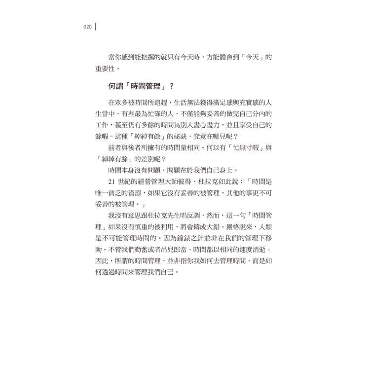 21 世紀的經營管理大師彼得・杜拉克如此說:「時間是唯一貧乏的資源,如果它沒有妥善的被管理,其他的事更不可妥善的被管理。」