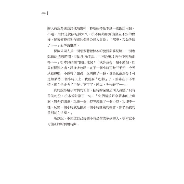 真的說得超乎常情的坦白,招待的保險公司人員聽了只有苦笑的份。松本並附帶了一句:「你們是按月拿薪水的上班族。對你們來說,玩樂一個小時等於賺了一個小時。我卻不一樣,玩樂一個小時就是損失一個小時賺錢的機會。你們跟我的差別就在這裡。」