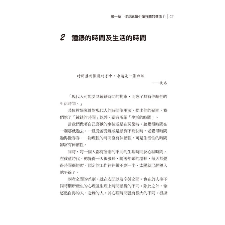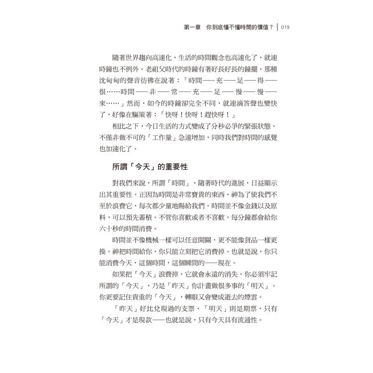 自從富蘭克林說「時間就是金錢」以後,這句話就時常被引用,這也等於是在說:「在相同的時間內,你做了多少有意義的事?」時間本身不會特別眷顧某一個人,問題在於——如何有效地利用相同的時間。