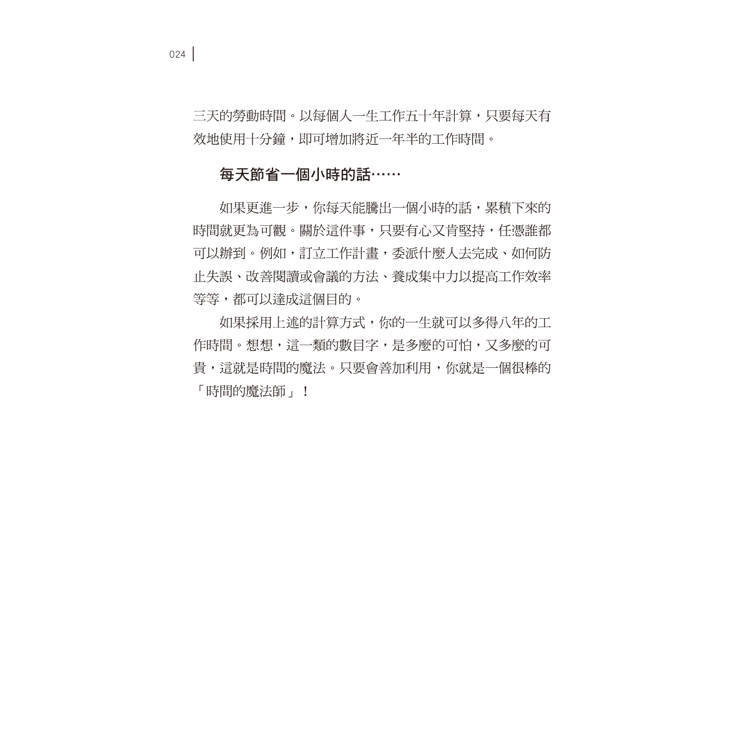 如果採用上述的計算方式,你的一生就可以多得八年的工作時間。想想,這一類的數目字,是多麼的可怕,又多麼的可貴,這就是時間的魔法。只要會善加利用,你就是一個很棒的「時間的魔法師」!