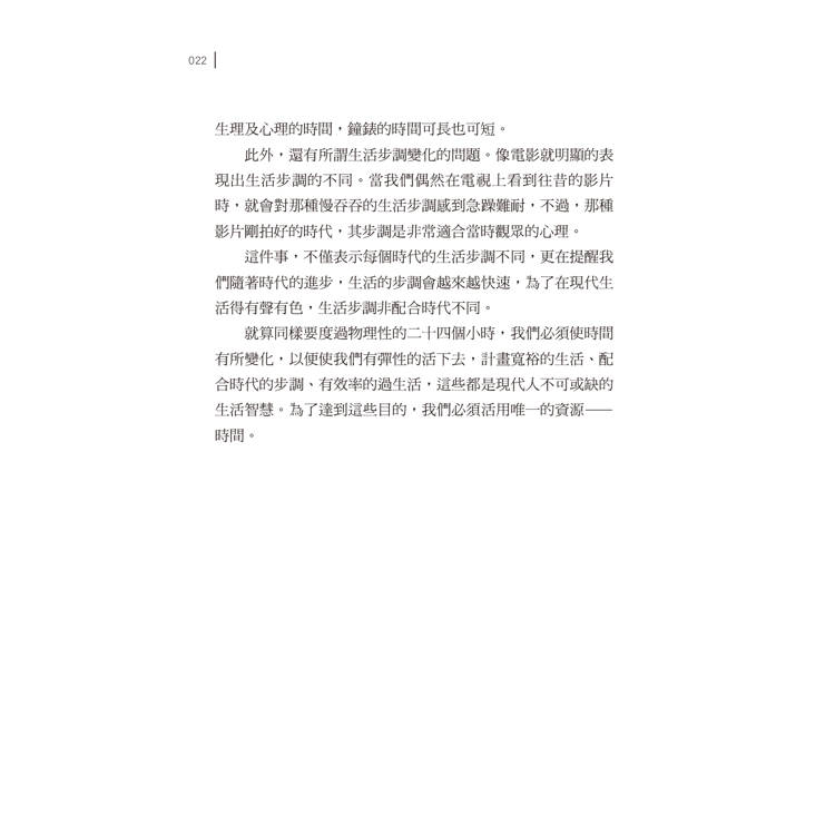 就算同樣要度過物理性的二十四個小時,我們必須使時間有所變化,以便使我們有彈性的活下去,計畫寬裕的生活、配合時代的步調、有效率的過生活,這些都是現代人不可或缺的生活智慧。為了達到這些目的,我們必須活用唯一的資源——時間。