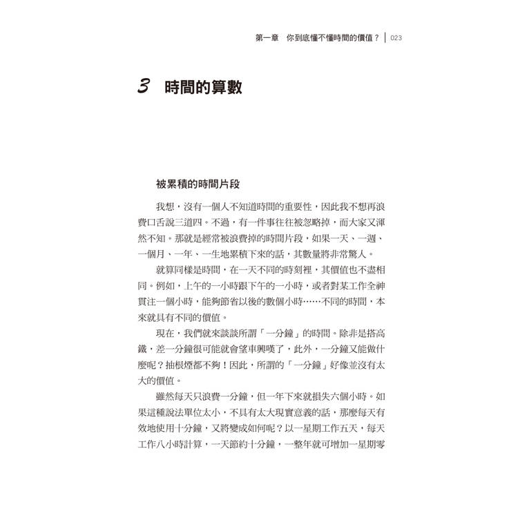我想,沒有一個人不知道時間的重要性,因此我不想再浪費口舌說三道四。不過,有一件事往往被忽略掉,而大家又渾然不知。那就是經常被浪費掉的時間片段,如果一天、一週、一個月、一年、一生地累積下來的話,其數量將非常驚人。