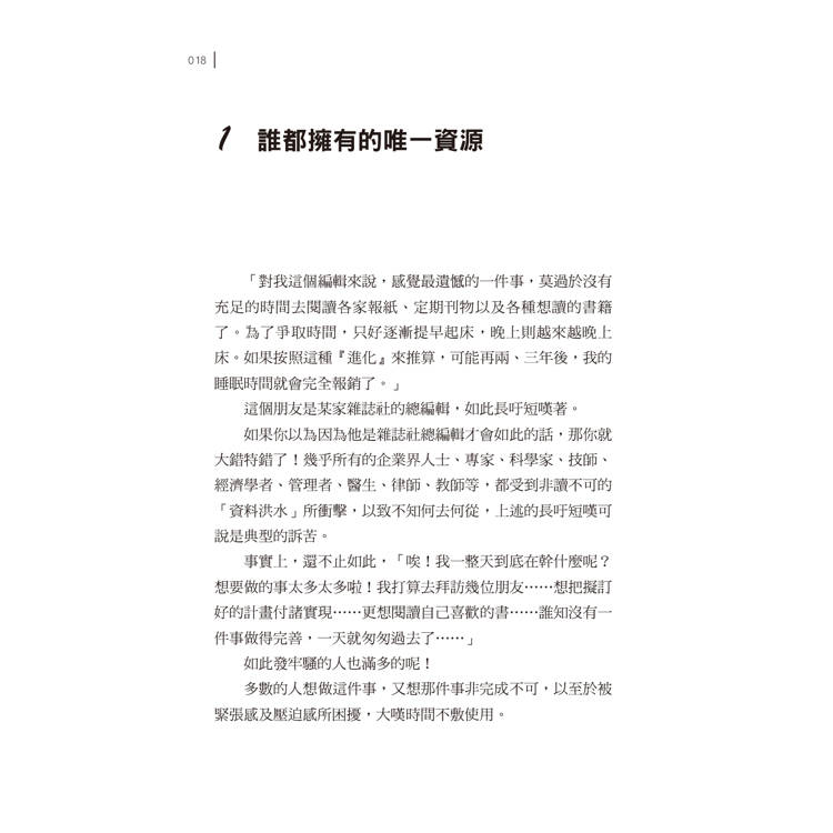 如今,我們正處於情報化的社會裡,每個人都忙碌得不可開交。為了避免被情報的洪水所沖走,如何完善地處置洶湧而至的工作,甚至為了享受生活的情趣起見,非得體會時間的有效使用法不可。因為,不管是從事任何工作或學習任何事物,只要能夠有效地使用時間,即可以把多餘的時間挪用於別處,如此一來,不但可以完成較多的工作,亦可以享受「從容不迫」的生活方式。