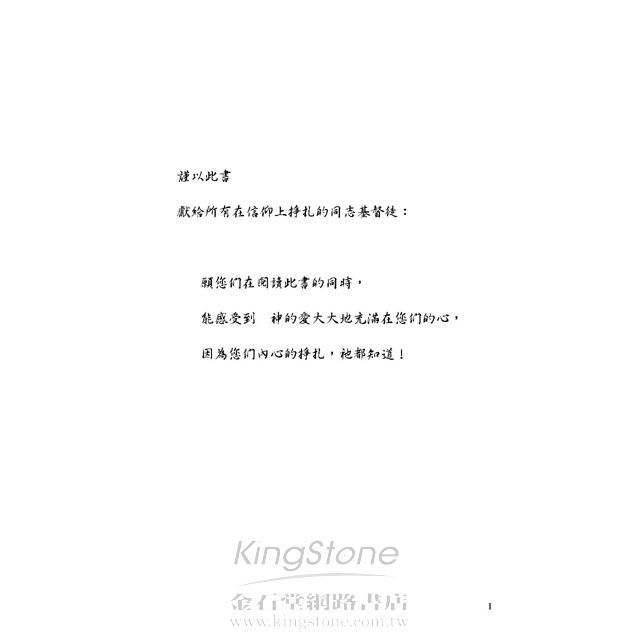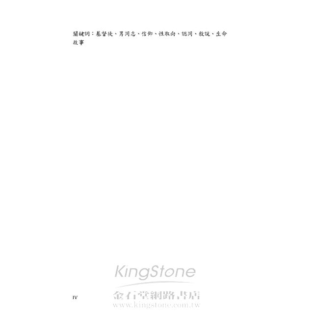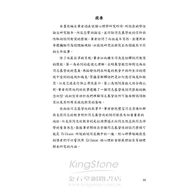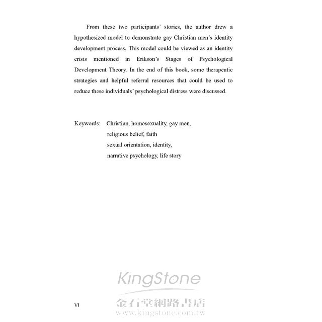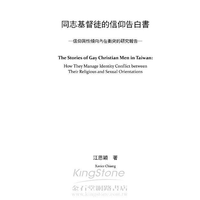 本書改編自筆者過去就讀心理學研究所時,所做出的學位論文研究報告,內容忠實的描述並討論同志基督徒信仰與性取向認同衝突的歷程。受訪者是兩位男性。並且採用社會建構論作為認識論視框,以敘說研究法撰寫出兩個截然不同的生命故事。第一為共同的處境之理解,表明基督教信仰對這兩位男同志基督徒的意義,再描繪他們在所處的教會中與所生活的環境中受到的歧視和偏見,緊接著解釋他們是如何應付偏見和衝突,以及怎樣在信仰上尋找出口。第二為認同歷程之結合與比對,筆者利用他們的故事建構了一個同志基督徒認同歷程的概念初型,此初型將有助於我們理解同志基督徒所可能面對認同衝突以及其所用的減低衝突之策略。
