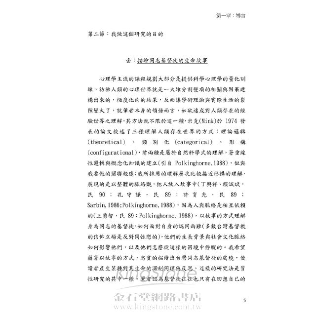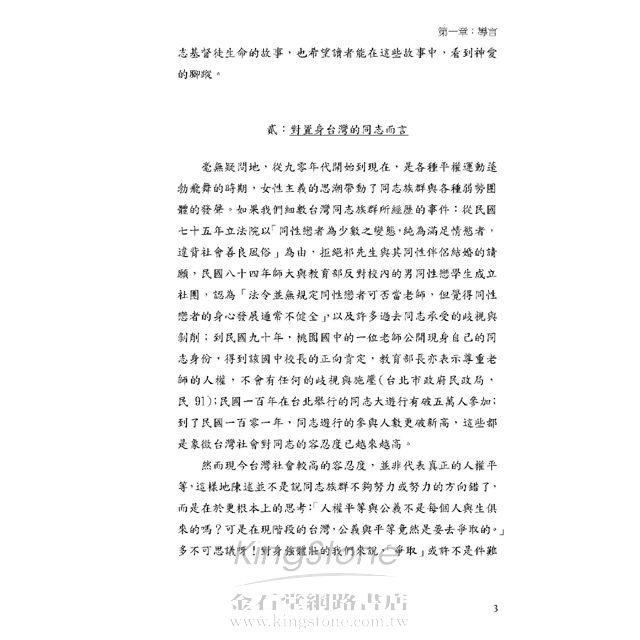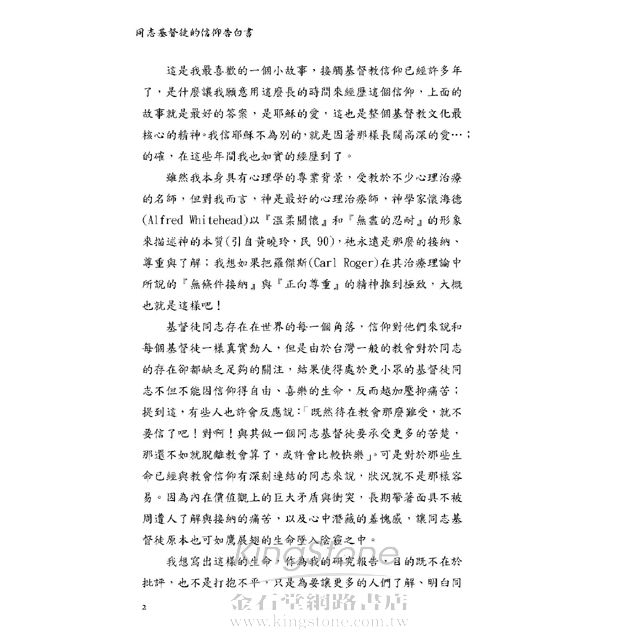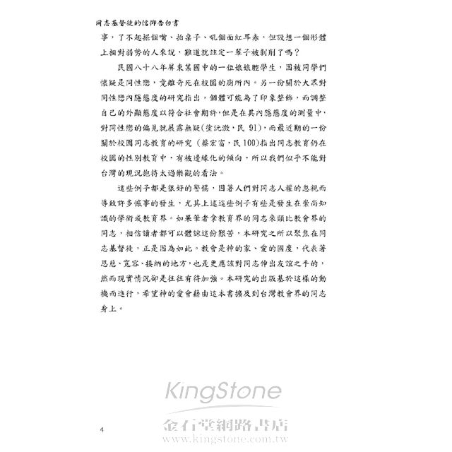 我想寫出這樣的生命,作為我的研究報告,目的既不在於批評,也不是打抱不平,只是為要讓更多的人們了解、明白同志基督徒生命的故事,也希望讀者能在這些故事中,看到神愛的腳蹤。