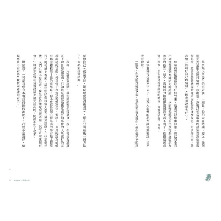 突然間,蛤蟆先生感覺到,他並非只能被動地接受別人的建議,然後又因做不到而挫敗無力。而是,他可以透過主動參與,為自己做些什麼。這正是心理諮商重視的——當事人得為自己的人生負起完全的責任。於是,蛤蟆先生與蒼鷺便展開了一連串「合作」的過程。