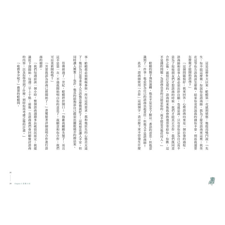 讀完全書,你會知道,心理諮商不是個愉快的對談過程;你可能要去觸及那些令你感到痛苦的情感、想法或回憶。然而,你願意投入越多,你越能從心理諮商中獲益。