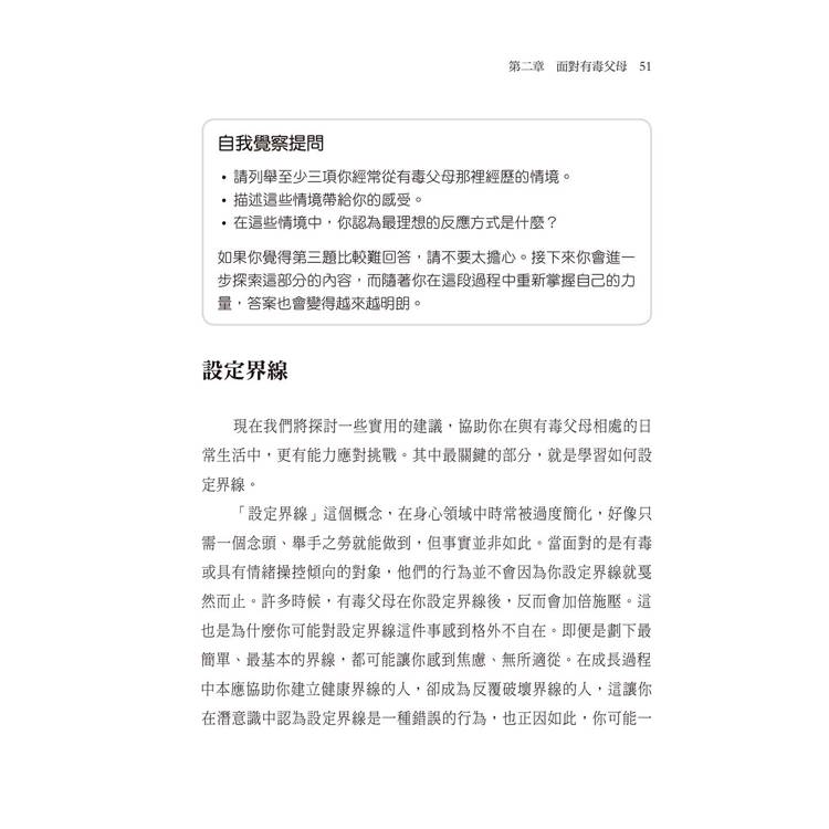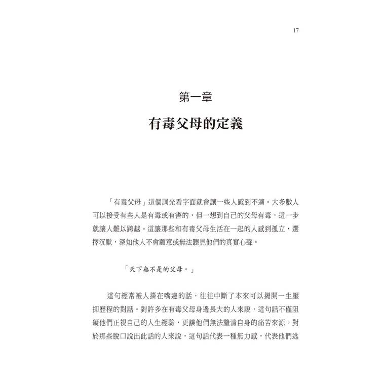選擇開始閱讀這本書是你人生中最關鍵也可能是最艱難的一步,你將發現,自己確實有能力掙脫有毒父母的束縛,重新掌握人生的主導權。
