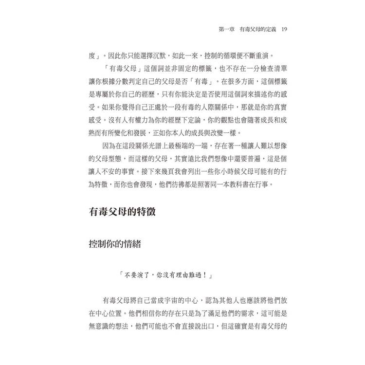 •全新的視角:明確理解「有毒父母」的定義,認識那些潛藏在日常互動中的心理操控。
