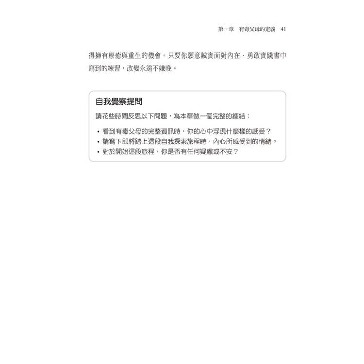 從理解有毒父母的本質開始,到學會設定界限、回到當下、照顧內在小孩,這是一趟溫柔但深刻的旅程