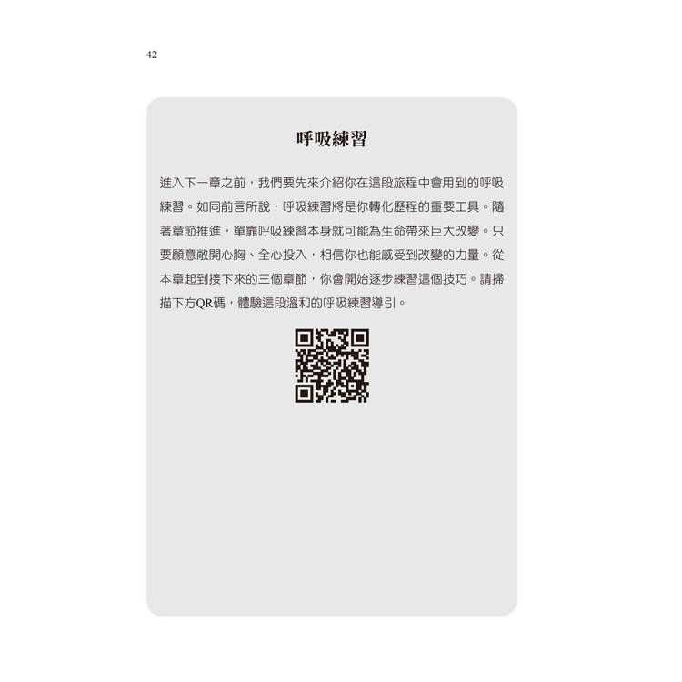對許多人來說,這正是他們一直在尋找但始終欠缺的那塊拼圖。每一章結尾你都會看到一個QR碼,掃描後會連結到一段帶領你進行呼吸練習的影片,最後會搭配一段觀想練習,協助你整合每章的練習成果。