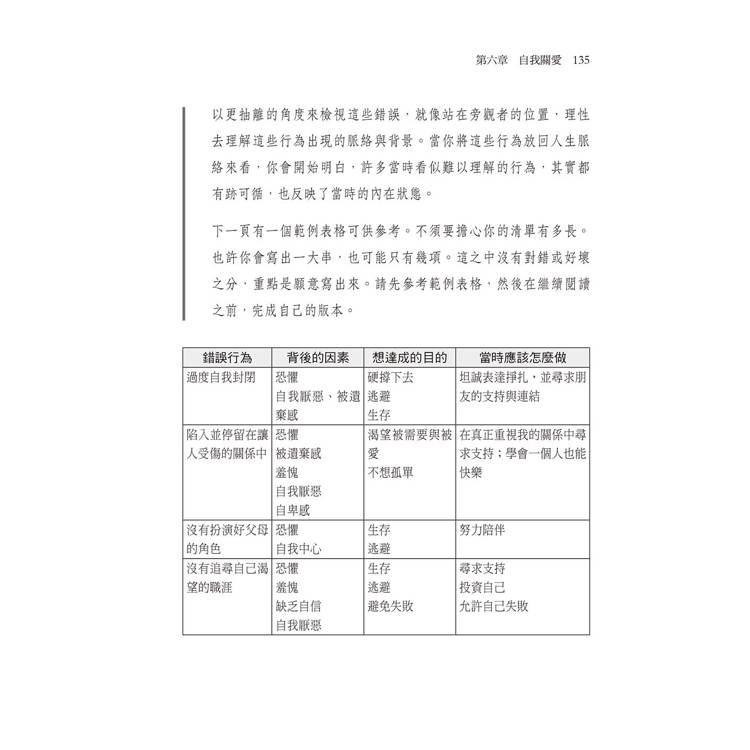 你也須要對自己溫柔一點,這不是一場競賽,這本書也不是一個考試,無所謂「表現得好不好」。你只須要在生活中留出時間,以適合自己的步調來逐步完成。有時候這些練習可能會讓人感到有些壓力,你可以暫時放下書,稍後再回來繼續。感到緊張或害怕很正常,有時你須要突破這些情緒,但每個人都有極限,生活有時會讓人感到壓力重重,尤其當你經歷過不幸的成長經歷,所以要好好善待自己。