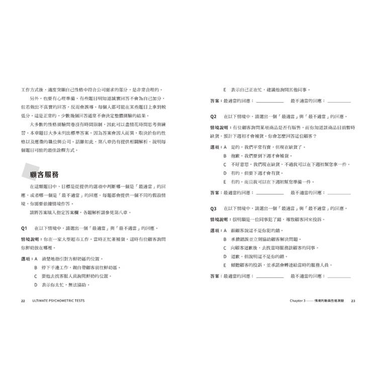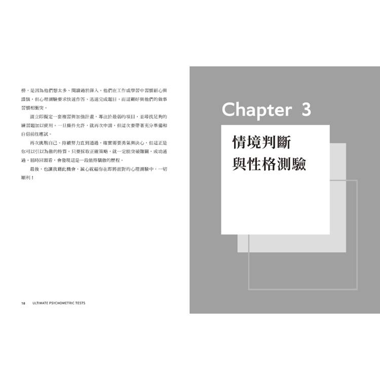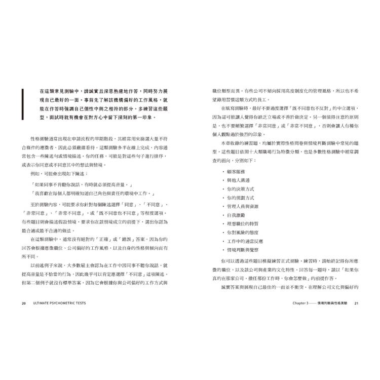 本書收錄的才能測驗(aptitude tests)範圍廣泛,涵蓋了實際的甄選與評估時常見的測驗類型。這些測驗適合中學、大學生以及在職人士。