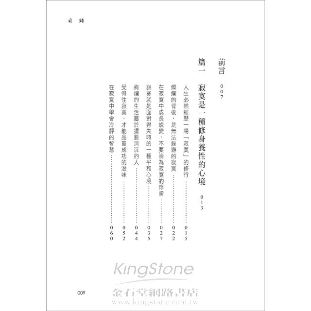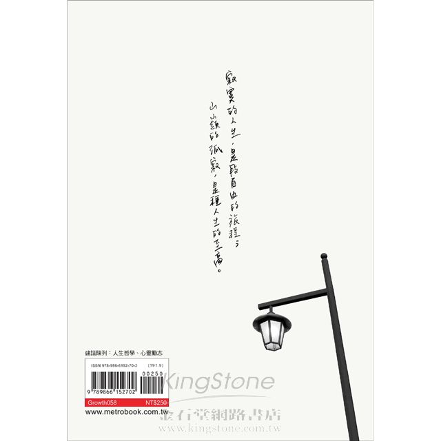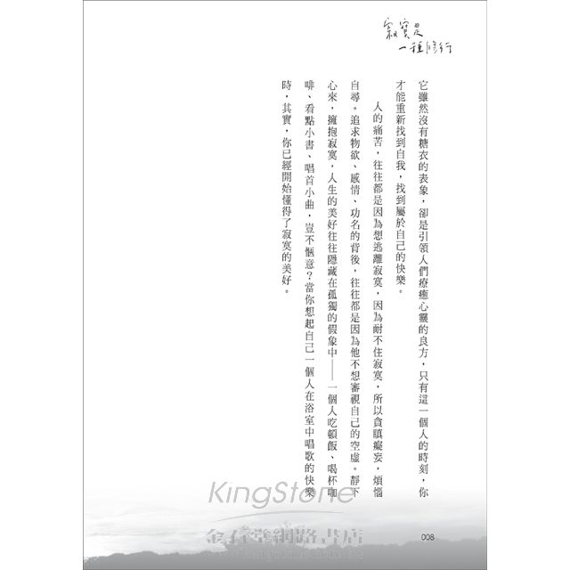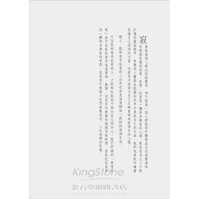 只有學會在孤獨中尋找自由、自平靜時積蓄力量、從超脫裡看透世情,方能遠離塵囂,才能靜心,進而專注自我的心靈,更全面的思考人生。