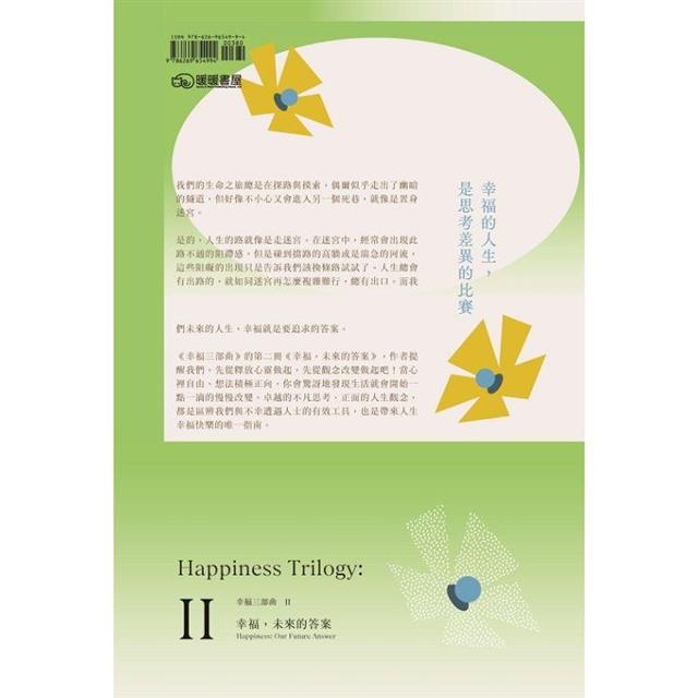 《幸福三部曲》的第二冊《幸福,未來的答案》,作者提醒我們,豐富幸福的人生,不是來自窄淺的空間,而是寬廣的外在世界。若是走不出洞口,逛不出迷宮,像是人的情緒沒有了出路,生命與生活就只會越走越窄了。