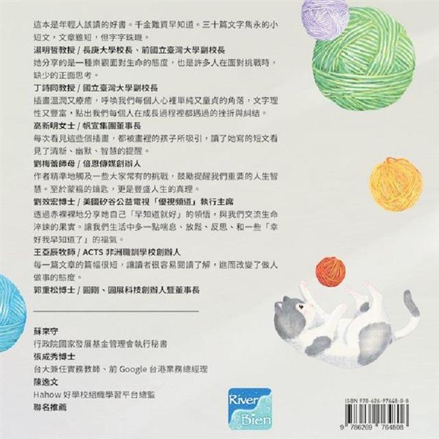 謝謝心思細膩又想像力豐富的河畔果|邊歆茹,將古今中外的生活智慧王們齊聚一堂,透過赤裸裸地分享她自己「早知道就好」的領悟,與我們交流生命淬鍊的果實。30篇輕鬆的小故事,配上30幅可愛的插圖,再加上獨特的邊氏幽默,讓我們生活中多一點喘息、放鬆、反思、和一些『幸好我早知道了』的福氣。
