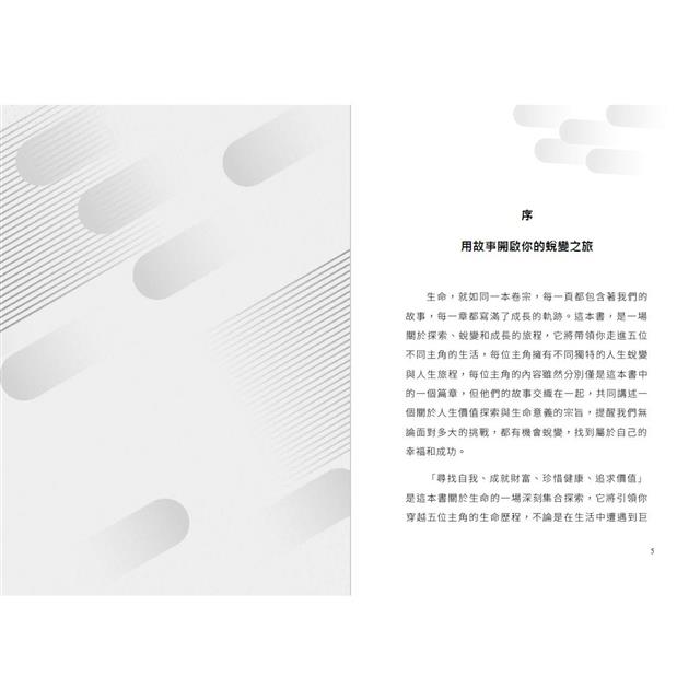 本書正如序文所提到的,是一場關於探索、蛻變和成長的旅程,它並不僅僅是一本故事集,更是一本關於生活哲理和成長的指南。這是一本能夠觸動靈魂、啟發思考的書籍,其中蘊含著五位主角的真實故事,每位主角的生命經歷都將帶給您深刻的啟示,適合正在尋找生活意義和幸福的人,以及面臨挑戰、渴望改變的人。不僅會讓您思考自己的生活,激勵您去勇敢追求夢想,更深入地了解生命的真諦,內容充滿了希望和勇氣,它將讓您明白,無論生活中面臨多大的挑戰,都有機會找到幸福和成功。