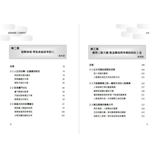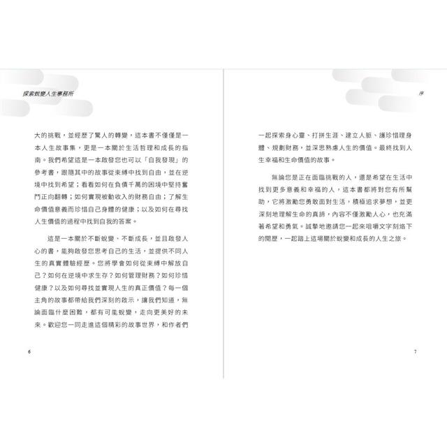 「尋找自我、成就財富、珍惜健康、追求價值」是這本書關於生命的一場深刻集合探索,它將引領你穿越五位主角的生命歷程,不論是在生活中遭遇到巨大的挑戰,並經歷了驚人的轉變,這本書不僅僅是一本人生故事集,更是一本關於生活哲理和成長的指南。我們希望這是一本啟發您也可以「自我發現」的參考書,跟隨其中的故事從束縛中找到自由,並在逆境中找到希望;看看如何在負債千萬的困境中堅持奮鬥正向翻轉;如何實現被動收入的財務自由;了解生命價值意義而珍惜自己身體的健康;以及如何在尋找人生價值的過程中找到自我的答案。