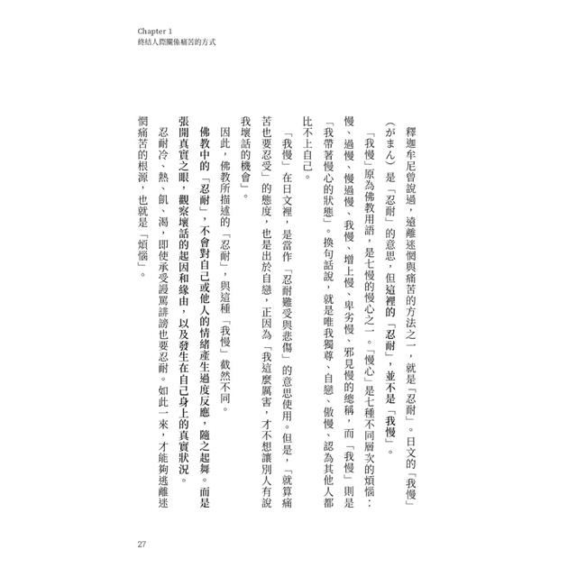 「苦」絕非來自外在,而是自己內在所創造的東西。當你能夠理解這個真相,才會發現緊抓著痛苦不放的,其實正是自己。接下來要做的,就只是放手。但是,要鬆手卻非常困難。