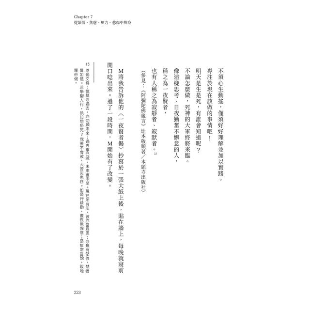 注意到這點之後,除了吟誦佛經,我也開始從佛經中找尋靈感,以面對在現實社會中遇到的問題。而這麼一做之後,我發現:「佛經中記載的內容,對於人生所有的煩惱,從怎麼洗臉、冥想、如何專注、家庭和樂、教養子女、健康到資產累積的方式等,都提供了具體的提示。」