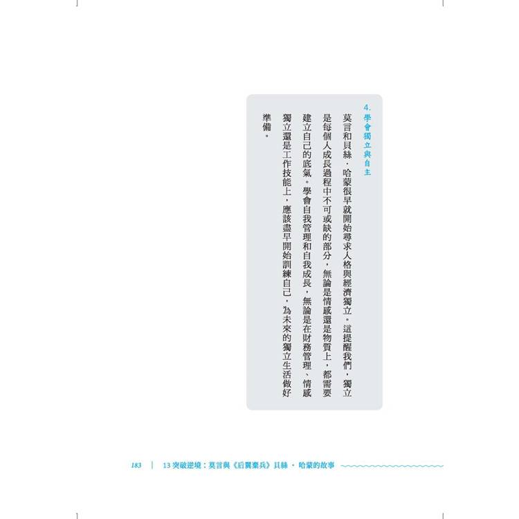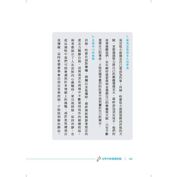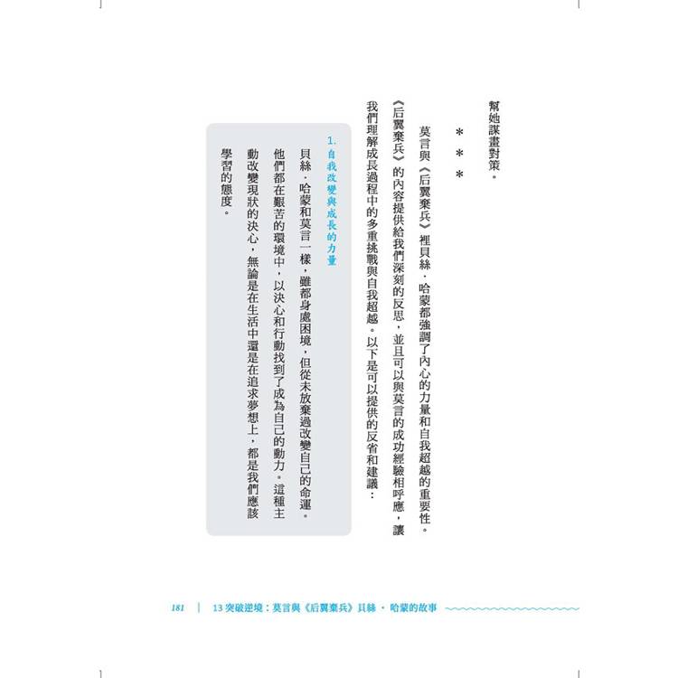 如果你正在經歷失戀的痛苦或人生的低谷,這本書也不會讓你失望。《失戀三十三天》的蛻變之旅,以及諾貝爾文學獎得主莫言與《后翼棄兵》的故事,告訴我們:每一場低潮背後,都是自我蛻變的契機。