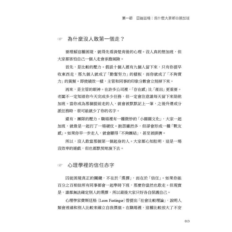 首先,是比較的壓力。假設十個人裡有九個人留下來,只有你提早收東西走,那九個人就成了「勤奮努力」的樣板,而你就成了「不夠賣力」的異類。即使績效一樣,主管和同事的印象分數會立刻掉下來。