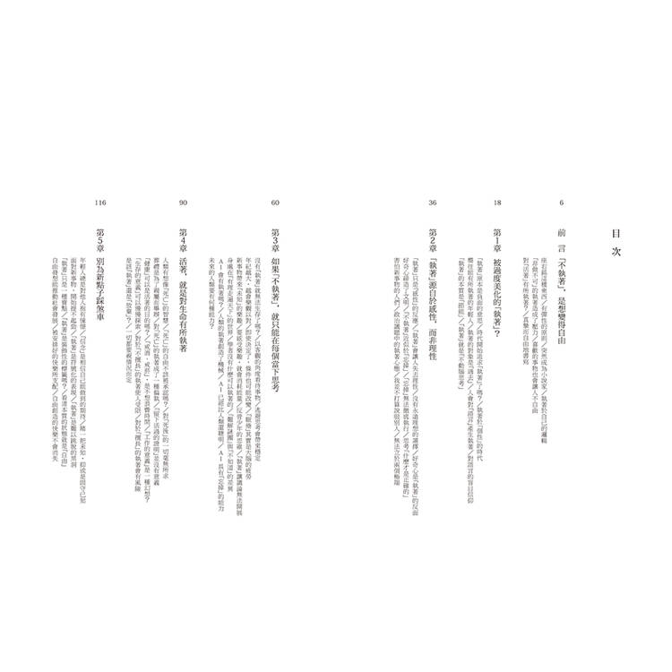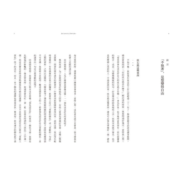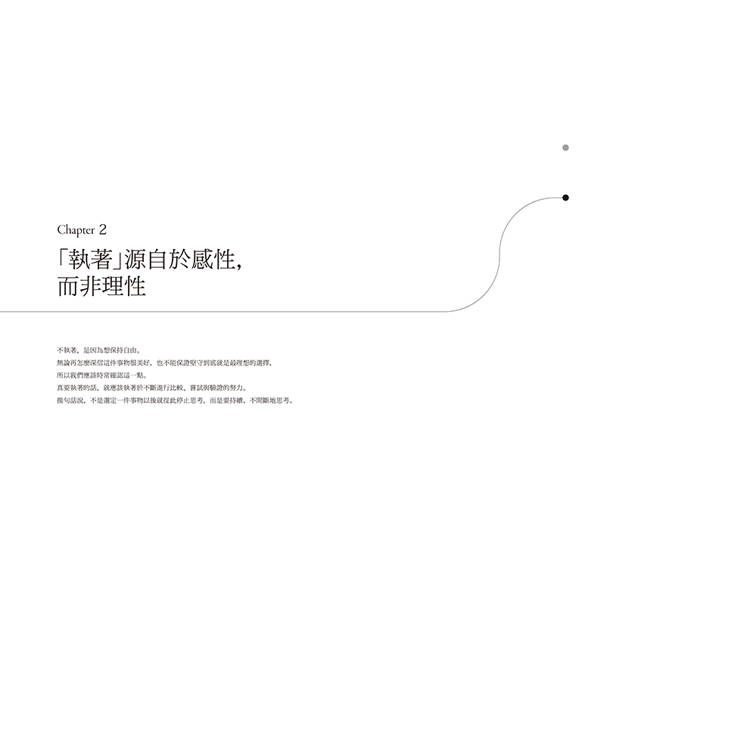 ◎最接近我心中「不執著」印象的動詞是「忘掉」。讓自己站在不同的立場去想像——將發生過的事當作沒有發生過,反過來也要想像,那些沒有發生的事如果發生了,世界會變成什麼模樣,藉此把思考的自由度發揮到極致,以不帶個人經驗的方式做出客觀的判斷。