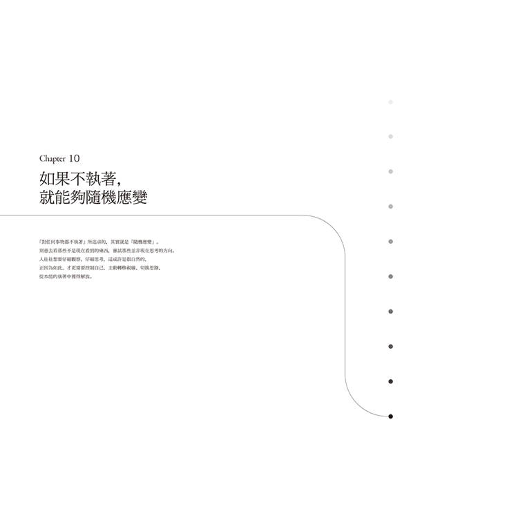 可以不執著:不執著,就能夠隨機應變、獲得自由。跳脫「自我」的視角,拉開距離重新對焦,時刻保持讓思考朝各種方向展開的能力。
