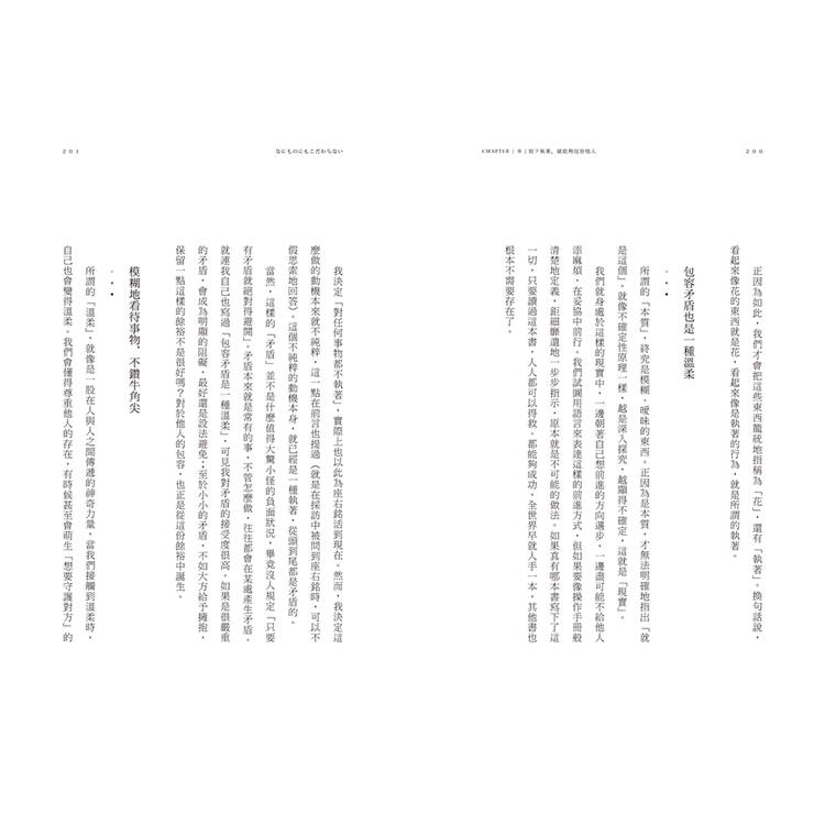 在這裡,希望大家能再次想起「朝模糊的方向前進」這個方針。既然對任何事物都不執著,就不該過度鑽牛角尖,也不能走向完美主義。無論是包容他人、還是對他人溫柔,如果徹底實行,在某種意義上也屬異常。畢竟,這一切行為都建立在「自我」的存在之上,只要這個基礎還在,就不可能完全不執著於自我,也無法讓自己消失,這終究是矛盾的行為。
