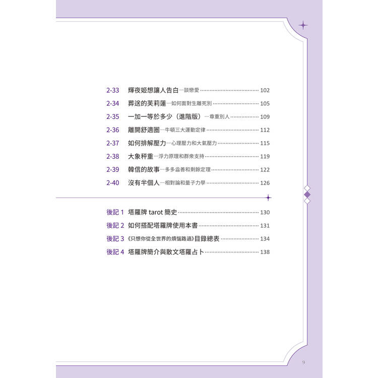 這本書延續了上一本書的風格,涵蓋了不同領域的知識、人生階段的各種問題,用說故事的方法,讓讀者能輕鬆閱讀;可以當成勵志書提昇並放鬆心靈、解決自己的煩惱;亦可作為工具書查找問題,或是搭配塔羅牌使用,為您找出人生的方向(參考後記與目錄總表)。