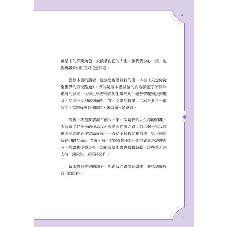 最後,我還要感謝三個人。第一個是我的人生導師劉墉,因為讀了許多他的作品我才會走向作家之路;第二個是為我寫推薦序的暖心作家高愛倫,一直給予我肯定和指導;第三個是我在追的Vtuber- 希靈,每一次的直播不管是雜談還是塔羅牌占卜,都讓我獲益良多,知道我要出書也給我鼓勵。這些貴人的支持,讓我能一直堅持寫作。希望購買本書的讀者,能從我的書得到改變,並找到屬於自己的道路。