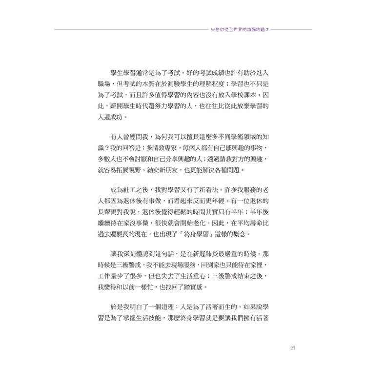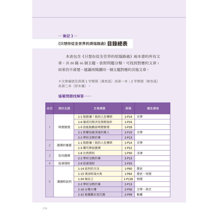 喜歡本書的讀者,建議您也購買我的第一本書《只想你從全世界的煩惱路過》。因為這二本書談論的內容涵蓋了不同年齡層的煩惱,從學生學習到面對生離死別、經營管理到投資理財、父母子女相處到面對主管、文學到科學;二本書共八十篇散文,為您解決各種問題,讓煩惱只是路過。
