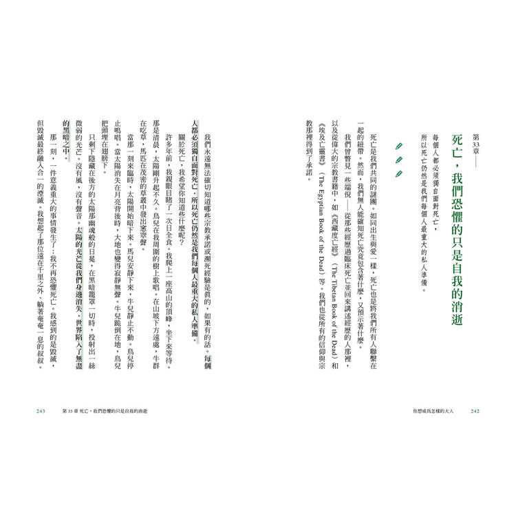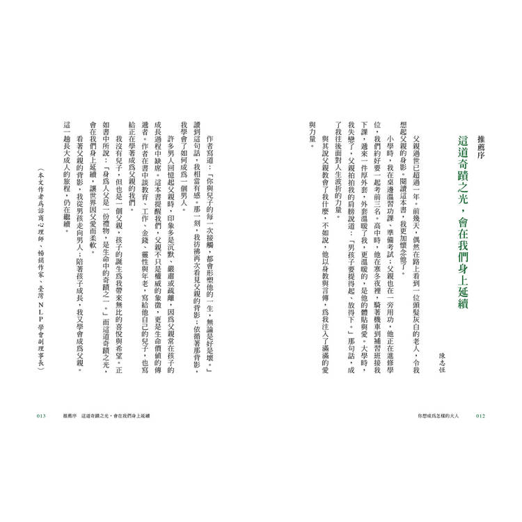 二十週年紀念版前言 暢銷全球,引發共鳴的經典 作家的作品就像他的孩子。我們生下來,把他們送到這個世上,焦慮地看著他們在紛擾和嘈雜的人生中掙扎著尋找自己的定位。 《你想成為怎樣的大人》是我文學創作的第一個孩子。正如所有父母所知,每個孩子在你心目中都有獨特的地位。《你想成為怎樣的大人》帶有一種清晰與真摯的驚奇感受,我此後再也無法企及。我是如此深愛著它。 它也為我開闢一條道路,塑造我往後所有的作品。雖然它擁有獨特的純粹與風格,但它讓我知道,我可以,也應該—事實上,我必須—發掘最真誠的自我去寫作,捐棄憤世嫉俗、嘲諷和文學技巧上的小聰明。它讓我明白,我是用心寫作的作家。 如今,二十年過去,十幾本書問世,《你想成為怎樣的大人》依然守護著它的文學兄弟們,以同理之心和關懷之情發聲,無論他們的聲音或目的為何。 它也在這世上找到了自己應有的位置。 對於希望將父親的話傳承給兒子的單身母親來說,這本書是值得信賴的朋友;對於希冀為兒子清楚闡述人生大哉問的父親來說,這本書是嚮導;對於走在渴望成為有價值男人的道路上找到體貼伴侶的年輕男士來說,這本書是良伴。 書裡的其中幾個章節在網路上廣為流傳,並受到全球各地讀者的擁戴。 「旅行」的章節已成為世界各地年輕部落格的熱門內容。「伴侶與婚姻」和「墜入愛河」已引用於全球的婚禮。「心靈之旅」已成為傳統宗教派別與信仰以外精神探尋者的讚歌。英國首相大衛.卡麥隆(David Cameron)甚至在二○一一年父親節致全國演說中引用了《你想成為怎樣的大人》,當時正值他父親逝世週年忌日。我的文學之子確實已在世上嶄露頭角。 在這次的二十週年紀念版本中,我並不想大幅改動文本,破壞了原作的清新感和神妙之處。有些內容我現在可能會用不同的方式表達,或強調不同的重點。但這書本身就有股魔力,而我透過長年的經驗了解到,無論這種魔法來自人性或文學,都不應貿然更動,而應尊重其存在,並努力成為它的守護者。 因此,我在這個版本裡只做了三大改動。 我增加了一章關於同性戀的內容,這是原版書中的疏忽,一些年輕男性和父親指出了這一點,他們覺得自己或兒子被排除在原版廣泛談論的範圍之外。 我還加入了一章,探討「離開」人生前一個階段,並進入另一個新階段,有多艱難——這是我在自己人生的真實經歷,也在別人的生命中多次見過。 此外,我還加了最後一章,內容之前就發表在我的另一本著作《簡單真理》(Simple Truths)中,以平靜的筆觸,講述了人生旅程的神祕與莊嚴。這似乎是這本書的恰當總結,正因這書誕生於對為人父這份難以言喻的禮物的驚嘆和感激之中。 我希望全新的版本能受到各位的喜愛。