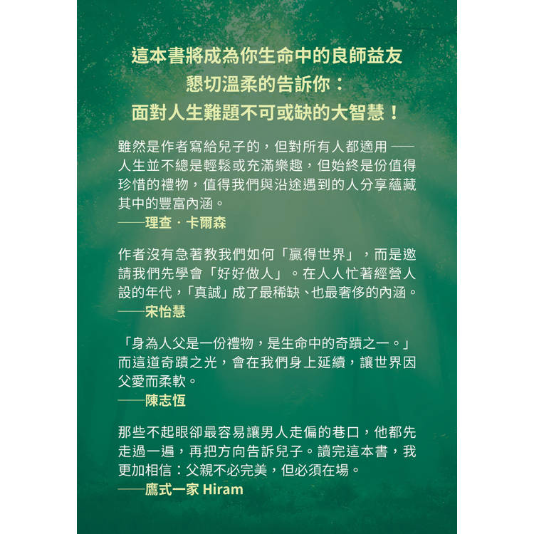 這位充滿愛的父親,是史丹佛畢業的人文學者,是加州大學柏克萊分校的宗教與藝術博士,是國際知名的藝術家,也是一位充滿同理心的教育家。他以犀利的洞察力、溫柔動人的文筆,展現了從生活淬鍊的大智慧,對兒子,也對每個期盼成長的讀者訴說: