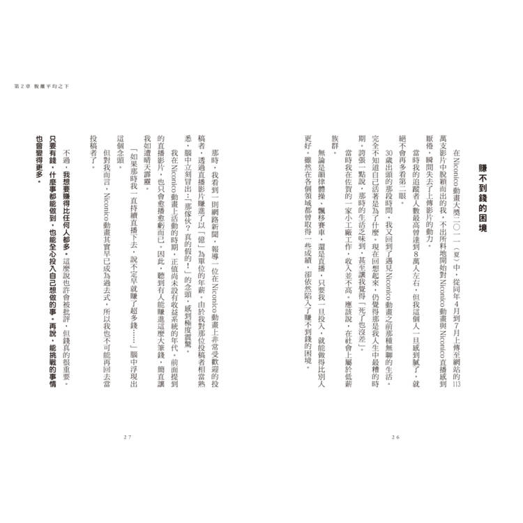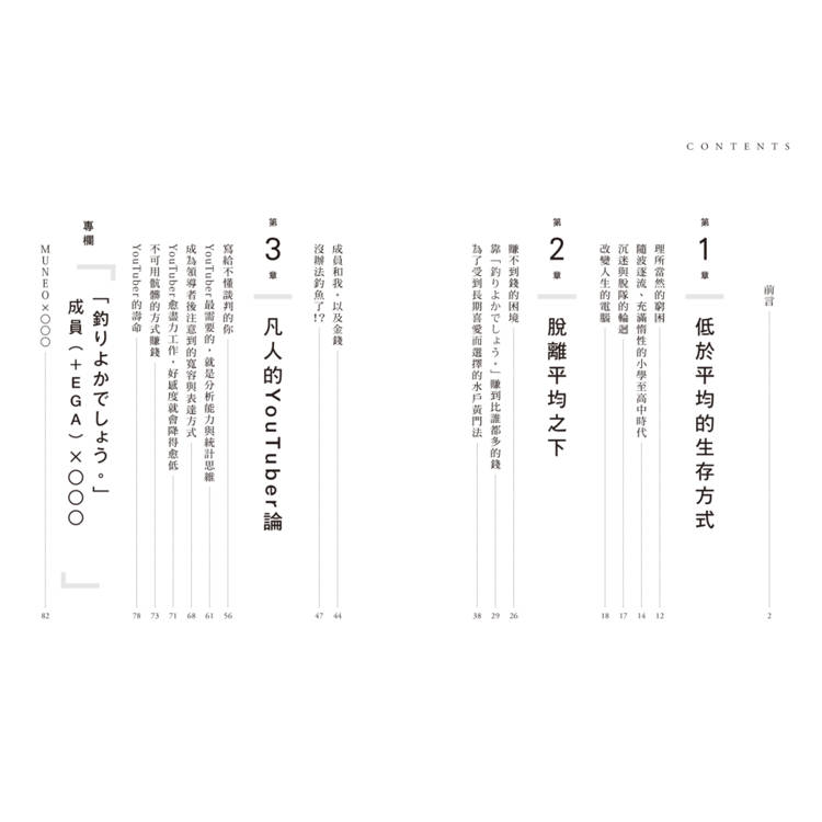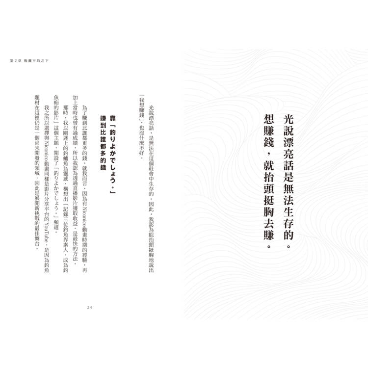 我想把這樣的我的思考方式與行動原理,赤裸裸地寫下來。老實說,若「釣りよかでしょう。」沒有大獲成功,我不過就是一個普通、熱愛釣魚、摩托車、高爾夫的大叔而已。而且雖然身為YouTuber,我也沒有過著什麼華麗的生活。當然,我能花在拍影片及興趣上的錢比一般人多一點,但我的花費也只限於這些事情,平時真的過著非常樸實的生活。所以,我的思考方式與行動選擇,其實任誰都能輕易模仿。因為這些都是我從當員工時就一直持續在做的事,我也從未做過什麼困難的選擇或特別的事。