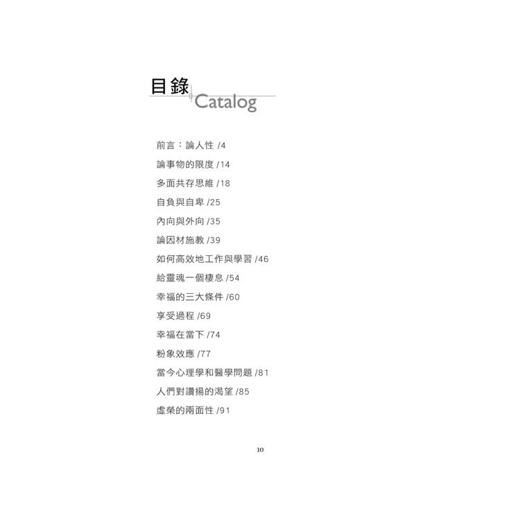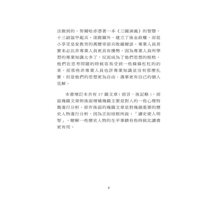 本書增訂本共有37篇文章(前言、後記略),前面幾篇文章與後面增補幾篇主要是對人的一些心理特徵進行分析,原作後面的幾篇文章是對幾個重要的歷史人物進行分析,因為正如培根所說:「讀史使人明智」,瞭解一些歷史人物的生平事蹟有些時候比讀書更有用。