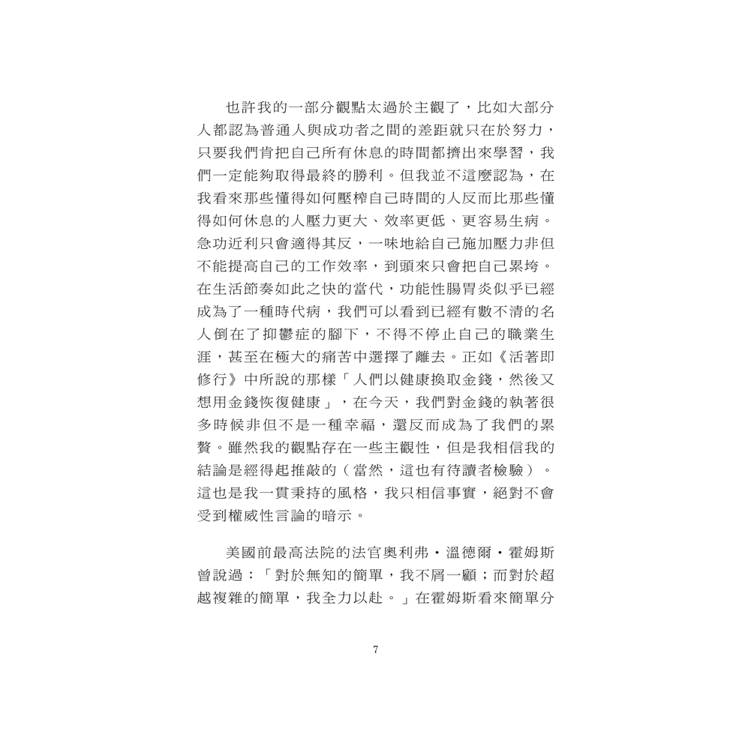 也許我的一部分觀點太過於主觀了,比如大部分人都認為普通人與成功者之間的差距就只在於努力,只要我們肯把自己所有休息的時間都擠出來學習,我們一定能夠取得最終的勝利。但我並不這麼認為,在我看來那些懂得如何壓榨自己時間的人反而比那些懂得如何休息的人壓力更大、效率更低、更容易生病。急功近利只會適得其反,一味地給自己施加壓力非但不能提高自己的工作效率,到頭來只會把自己累垮。在生活節奏如此之快的當代,功能性腸胃炎似乎已經成為了一種時代病,我們可以看到已經有數不清的名人倒在了抑鬱症的腳下,不得不停止自己的職業生涯,甚至在極大的痛苦中選擇了離去。正如《活著即修行》中所說的那樣「人們以健康換取金錢,然後又想用金錢恢復健康」,在今天,我們對金錢的執著很多時候非但不是一種幸福,還反而成為了我們的累贅。雖然我的觀點存在一些主觀性,但是我相信我的結論是經得起推敲的(當然,這也有待讀者檢驗)。這也是我一貫秉持的風格,我只相信事實,絕對不會受到權威性言論的暗示。