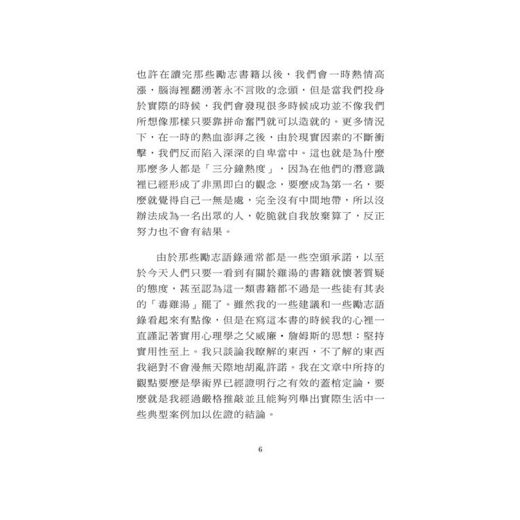 我們知道大部分自我激勵類書籍都有「承諾多,實效少」的通病,諸如「要做就做第一名」、「幸福生活五步法」之類的勵志語錄,讀來都是令人心血來潮、激情澎湃,勵志一定要成為最優秀的人。但是很快當我們投身實際的時候卻又陷入了迷茫之中,因為這些書籍雖然不斷地激勵著我們的鬥志,但是這些語錄本身卻沒有給我們指明具有實際意義的改變方向。在我看來,這些勵志書籍更多時候非但不能幫助我們改變自己,反而在不斷地強化我們潛意識裡面的「完美主義」,使我們陷入非黑即白的極端當中。能夠事事都盡善盡美當然最好,誰不願自己的生活事事都完美呢?但是很多時候我們對於完美的幻想僅僅只是建立在現實生活中不可能事事都盡善盡美的基礎之上,所以這也就註定了我們對完美的追求是註定失敗的。也許在讀完那些勵志書籍以後,我們會一時熱情高漲,腦海裡翻湧著永不言敗的念頭,但是當我們投身於實際的時候,我們會發現很多時候成功並不像我們所想像那樣只要靠拼命奮鬥就可以造就的。更多情況下,在一時的熱血澎湃之後,由於現實因素的不斷衝擊,我們反而陷入深深的自卑當中。這也就是為什麼那麼多人都是「三分鐘熱度」,因為在他們的潛意識裡已經形成了非黑即白的觀念,要麼成為第一名,要麼就覺得自己一無是處,完全沒有中間地帶,所以沒辦法成為一名出眾的人,乾脆就自我放棄算了,反正努力也不會有結果。